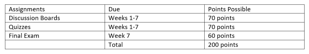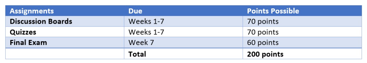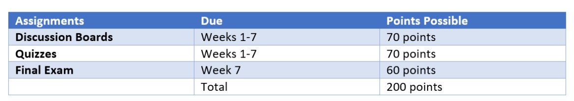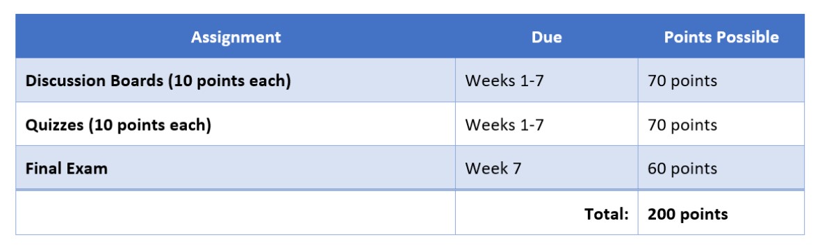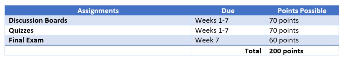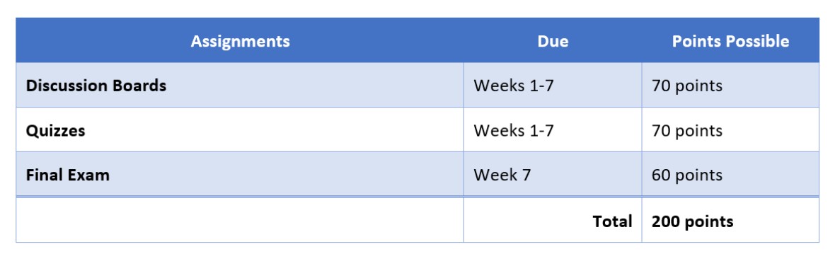 Screen reader reads Table 2: Assignments, due, points possible, discussion boards, Weeks 1-7, 70 points, quizzes, Weeks 1-7, 70 points …etc.