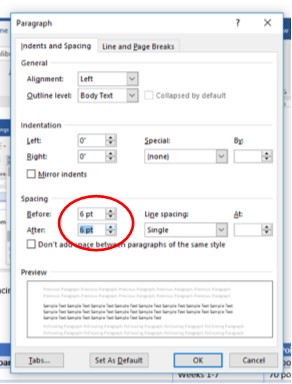 MS Word uses 12 pt as the default size and spacing. For a table, I like to use half of that size (6 pt) before and after the text in a table.