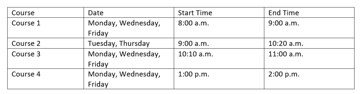 Screen reader reads Table 1: Course, date, start time, end time, course 1, Monday, Wednesday, Friday, 8:00 a.m., 9:00 a.m., course 2, Tuesday, Thursday, 9:00 a.m., 10:20 a.m. …etc.