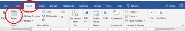 First, we need to create a table using the built-in MS Word Table feature in the Insert tab.