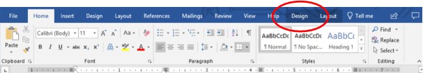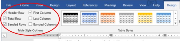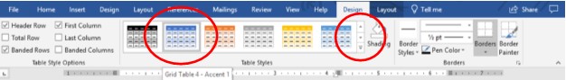 To format your table, you’ll work in the Design tab. This tab automatically appears when you are in your table. If you lose it, just click anywhere in your table and it should appear again.